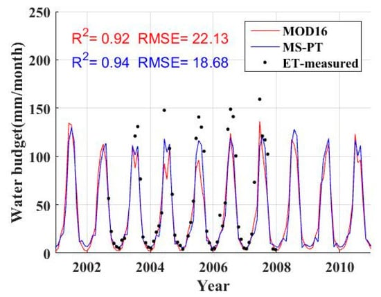 The monthly time series comparison of MS–PT-based ET and MOD16 ET in the Changbaishan station. RMSE is in units of mm/month.