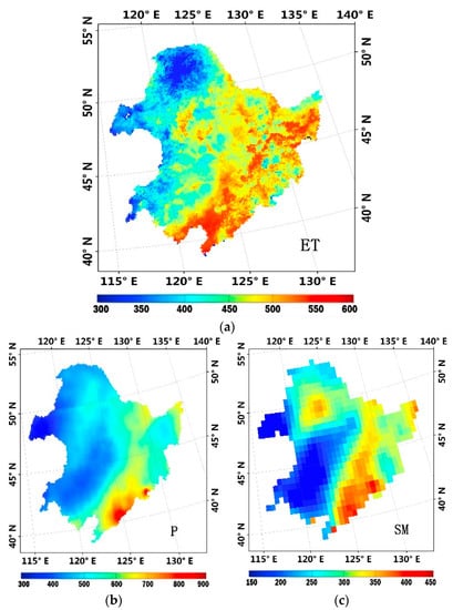 Spatial patterns of (a) multiyear average ET, (b) multiyear average precipitation, and (c) multiyear average soil moisture in Northeast China. All are in units of mm/year.