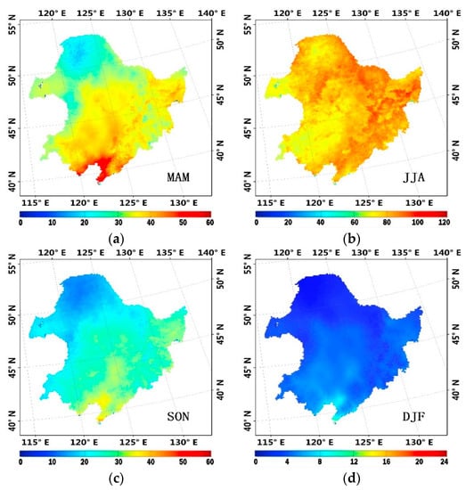 In addition, we also found that the regional distribution characteristic of ET over Northeast China differs among the four seasons. For example, during MAM, peak ET occurs in the southeastern part of the region, which has plentiful solar radiation and rising temperature. However, when summer comes, peak ET expands and moves northward (Figure 6b). Previous study states that, accompanied by plentiful solar radiation, rising air temperature, and fierce vegetation transpiration, the ET of the forest ecosystem is stronger than other ecosystems in the summer []. As seen from Figure 6b, the region with high ET is mainly distributed in the north and east regions of Northeast China, where forests were densely distributed. In other words, the distribution of forest determines the distribution characteristic of ET in JJA. When the rainy season has gone and the air temperature is declining, ET has decreased noticeably from SON (September, October, and November) to DJF (December, January, and February). As a result, the ET of the southern part of the study area is higher than the northern part, which is different from the distribution feature of the ET in JJA.