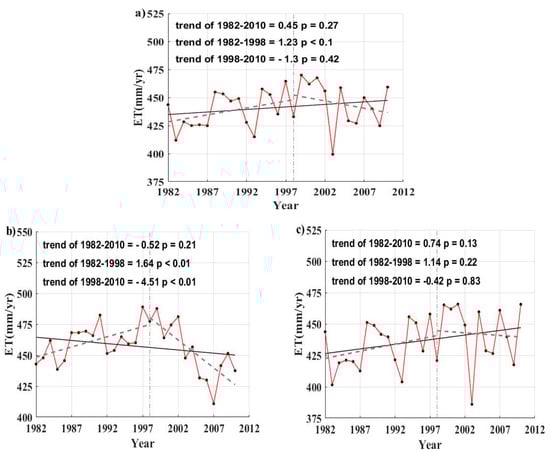 Considering the difference in climatic and hydrological condition between the LH basin and the SJ basin, we further calculated the trend of ET in the SJ basin and the LH basin, respectively. The difference in the ET trends between the pre-1998 period and the post-1998 period became more obvious. As seen from Figure 7b, in the years between 1982 and 1998, the annual land ET of the LH basin increased at a rate of 16.4 mm/decade (p < 0.01). After 1998, the annual land ET of the LH basin decreased rapidly with a linear trend of −45.1 mm/decade (p < 0.01). This enormous decrease in ET may be driven by the human activity, such as the reclamation of grassland into cropland or the exploitation of mineral resources []. Similarly, the annual land ET of the SJ basin increased from 1982 to 1998 with a linear fit having a slope of 11.4 mm/decade. After that, the annual land ET of the SJ basin also decreased by −4.2 mm/decade.