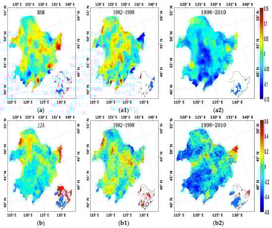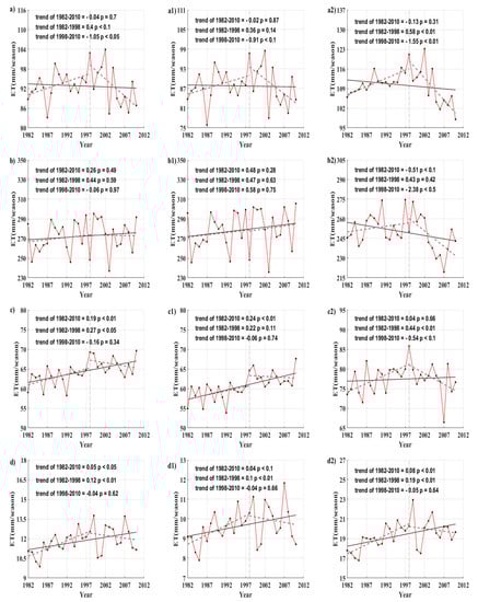 First column: interannual variability of ET from 1982–2010 in Northeast China: (a) MAM; (b) JJA; (c) SON; (d) DJF. Second column: interannual variability of ET in the SJ basin: (a1) MAM; (b1) JJA; (c1) SON; (d1) DJF. Third column: interannual variability of ET in the LH basin: (a2) MAM; (b2) JJA; (c2) SON; (d2) DJF.