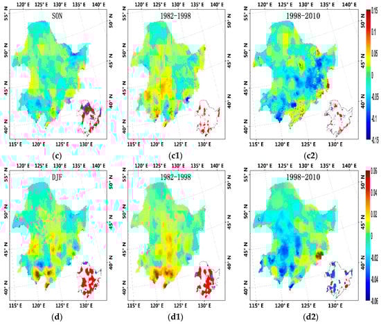 We also found the variation trend of interannual land ET has obvious seasonal cycles (Figure 8). The trends of seasonal ET for MAM, SON, and DJF are similar to the annual ET trend. However, for JJA, the annual ET changes irregularly. During 1982–2010, the annual ET of Northeast China increases at a rate of 0.26 mm month−1 per year in summer (p = 0.46). Such a non-significant increment mainly occurred in the SJ basin with 0.48 mm·month−1 per year. For the LH basin, the annual ET decrease at a rate of −0.51 mm·month−1 per year in summer (p < 0.1). Moreover, the magnitudes of the ET trends changes during JJA are higher than the other three seasons. For example, the annual ET increased at a rate of 0.47 and 0.43 mm month−1 per year in JJA before 1998 over the SJ basin and the LH basin. After 1998, ET still increased 0.58 mm month−1 per year in the SJ basin. For the LH basin, the trend of ET becomes negative and significant (−2.38 mm·month−1 per year, p < 0.05). On the contrary, as seen from Figure 8(d1,d2), the trend of ET is nearly zero for both the SJ basin and the LH basin during 1982–2010 (0.04 mm month−1 per year, p < 0.1; 0.08 mm·month−1 per decade, p < 0.01), which is far lower than the trend in JJA. This is because low temperature and limited solar energy restrain soil surface evaporation and vegetation transpiration.