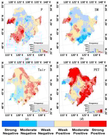 Map of the correlation coefficient between the annual ET trend (1982–2010) and the trend of (a) precipitation, (b) soil moisture, (c) Tair, and (d) PET. The inset panels show the frequency of various change trends. The degree of correlation is classified into three ranks according to the correlation coefficient: strong (R2 ≥ 0.7); moderate (0.3 < R2 < 0.7); weak (R2 ≤ 0.3).