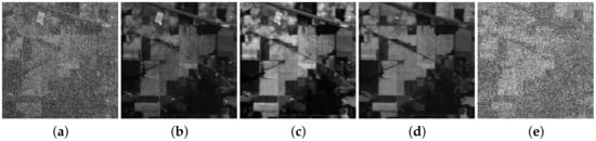 Although the traditional sparse regression unmixing methods have been widely used in sparse unmixing of HSI, they do not take the noise level of different bands into consideration. As can be clearly seen from Figure 1, the noise level of the five representative bands is different, and the noise levels of bands 1 and 220 are obviously higher than those of the other three bands. Besides, the previous works correlated with noise estimation of HSI [,,] have demonstrated that the hyperspectral imaging spectrometers adopt very narrow band, which makes the energy acquired in each band not enough to obtain high signal-to-noise ratio (SNR), and the HSI is usually corrupted by wavelength-dependent and sensor-specific noise, which not only degrades the visual quality of the HSI but also limits the precision of the subsequent image interpretation and analysis. That is to say, the noise of HSI is wavelength-dependent, thus the noise levels of different bands are different. However, the traditional sparse regression unmixing methods treat all the bands in the same way, which do not take the different noise levels of different bands into consideration. These bands having high level of noise will dominate the loss function , and the estimation of the whole abundance matrix would be seriously affected, which makes it deviate far away from the true value. Thus, it would be inappropriate to treat all the bands in the same way.