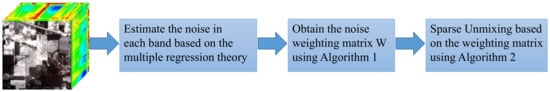 After obtaining the weighting matrix, we integrate the weighting matrix into the sparse regression unmixing framework to formulate our proposed method. Sparse unmixing is a semi-supervised unmixing method, which assumes that the observed HSI can be formulated as finding the optimal subset of pure spectral signatures from a prior large spectral library. In other words, hyperspectral vectors are approximated by a linear combination of a “small” number of spectral signatures in the library, and it is widely admitted that the sparsity of abundance can be characterized by the norm. To take the noise level and the sparsity of abundance into account, mathematically, it can be written as follows: