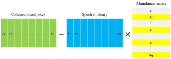 where denotes a vector of observed pixel in HSI, with D denoting the number of bands, and denotes the endmember, with M denoting the number of endmembers, denotes the abundance vector, and denotes the additive noise. Thus, the matrix formulation of LMM can be written as follows: