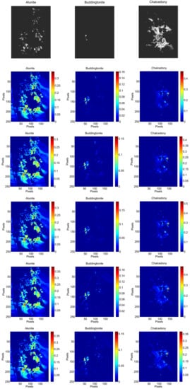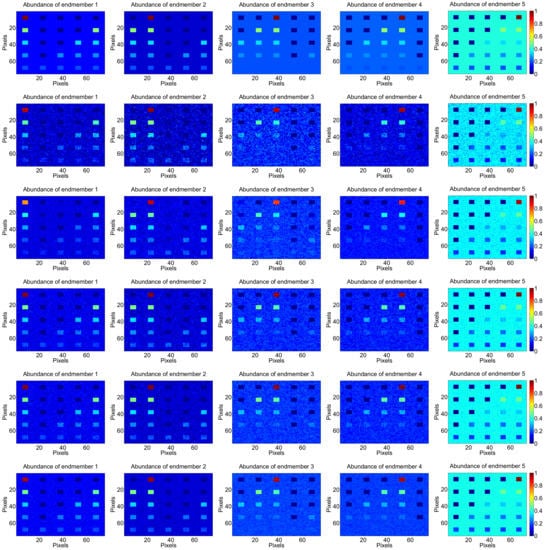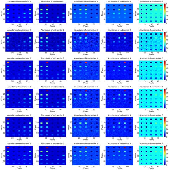 Abundance maps of 5 endmembers estimated with different methods under Gaussian white noise with both pure and mixed regions having 75 × 75 pixels and 224 bands. From top to bottom: ground truth, SUnSAL (), CLSUnSAL (), CUSAL-SP (), SU-NLE () () and SU-NLE () ().