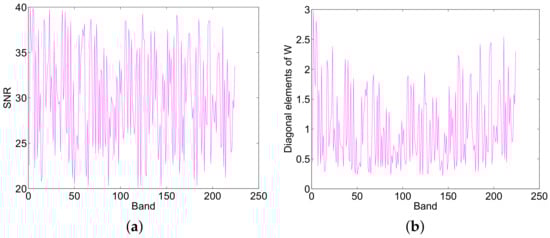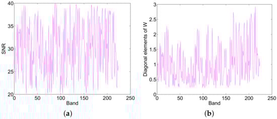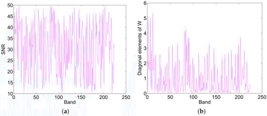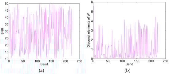 (a) The signal-to-noise ratio (SNR) of different band of the generated hyperspectral image (HSI) and (b) diagonal elements of the weighting matrix using proposed sparse unmixing method based on noise level estimation (SU-NLE) in simulated experiment I.