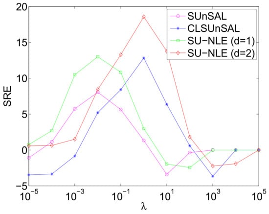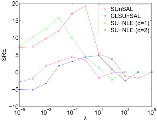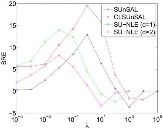 SREs of the methods SU-NLE, SUnSAL and CLSUnSAL as a function of varying regularization parameter under correlated noise with only mixed regions having 64 × 64 pixels and 224 bands.