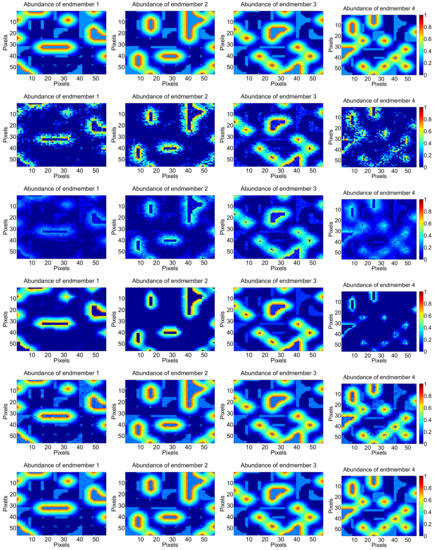 However, for the unmixing of HSI in practice, the ASC constraint not always holds true due to the intensive signature variability in an HSI []. Thus, we ignore the ASC constraint in unmixing of HSI.