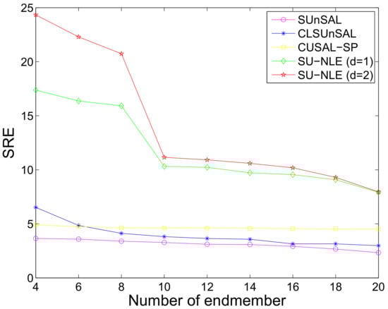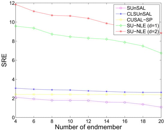 We also study the influence of the number of endmembers on the final unmixing performance when contaminated by correlated noise. We also perform the simulations 100 times to obtain the mean SREs. The setting for this experiment is as follows: image size is , q = 8, filter size is , and the SNRs of different bands range from 10 dB to 50 dB. Figure 18 shows the SREs of different methods as a function of varying number of endmember under correlated noise with only mixed regions having 64 × 64 pixels and 224 bands. Figure 18 also shows that the SREs generally decrease as the number of endmembers increases, because the spectral signatures are usually highly correlated. For all numbers of endmembers, the SREs of SU-NLE () and SU-NLE () are substantially higher than those of SUnSAL and CLSUnSAL, respectively, which also demonstrates that the integration of the weighting strategy into the sparse regression framework helps improve the unmixing performance.