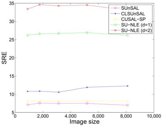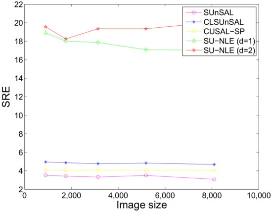 Moreover, we study the influence of image size on the final unmixing performance when the number of endmembers is 4. We also perform the simulations 100 times to obtain the mean SREs. The setting for this experiment is as follows: q ranges from 6 to 10, which makes the image size range from to ; the SNRs of different bands for all of the different image sizes range from 10 dB to 50 dB. Figure 11 shows the SREs of the proposed and compared methods as a function of varying image size under Gaussian white noise with only mixed regions having 64 × 64 pixels, 4 endmembers and 224 bands. As shown in Figure 11, the SREs of SU-NLE () and SU-NLE () are higher than those of SUnSAL and CLSUnSAL for different image sizes, respectively, which also demonstrates the importance of adopting the weighting strategy in the sparse regression unmixing framework. In addition, the SREs of the proposed and compared methods remain stable with the different HSI sizes, which demonstrates that the performance of regression-based unmixing methods is not sensitive to image size.