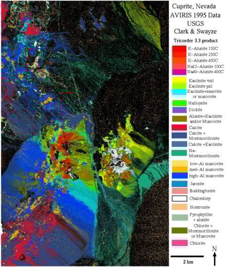 - Clark, R.N.; Swayze, G.A.; Livo, K.E.; Kokaly, R.F.; Sutley, S.J.; Dalton, J.B.; McDougal, R.R.; Gent, C.A. Imaging spectroscopy: Earth and planetary remote sensing with the USGS Tetracorder and expert systems. J. Geophys. Res. Planets 2003, 108. [Google Scholar] [CrossRef]