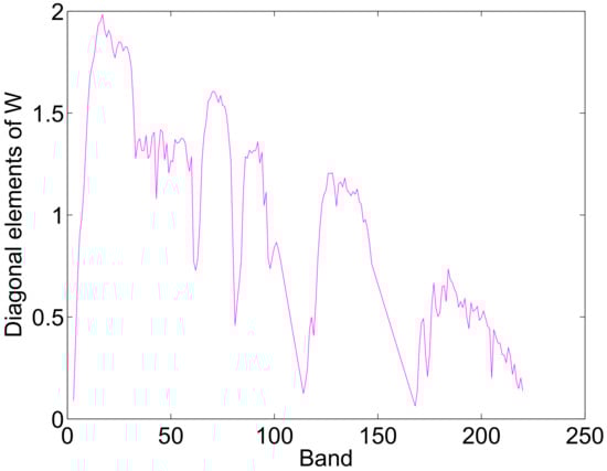 To overcome the above mentioned problem, according to the Figure 1 and the previous works correlated with noise estimation of HSI [,,], it is natural to assume that the noise levels at different bands are different. We adopt a simple and efficient noise estimation method based on the multiple regression theory, developed by Bioucas and Nascimento [], to estimate the noise in each band of HSI. The underlying reason is that the neighboring spectral bands are usually highly correlated, which makes the multiple regression theory well suited for noise estimation of HSI.