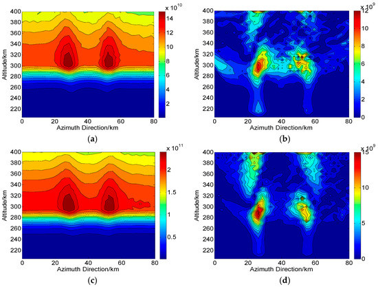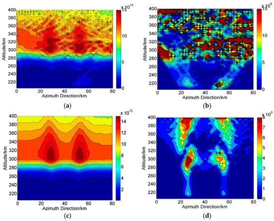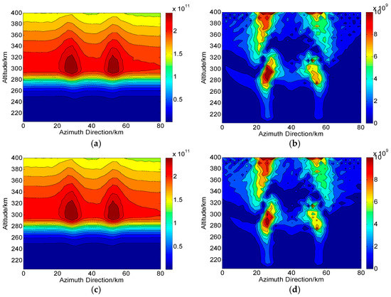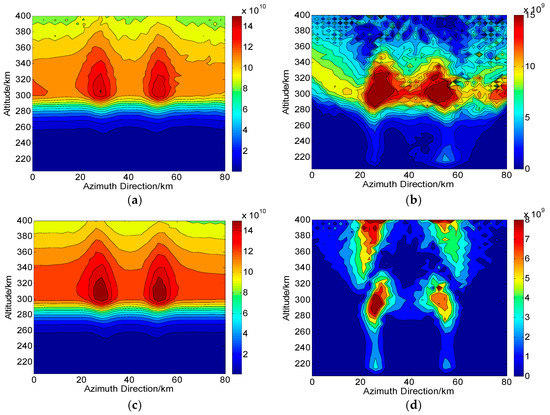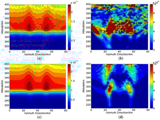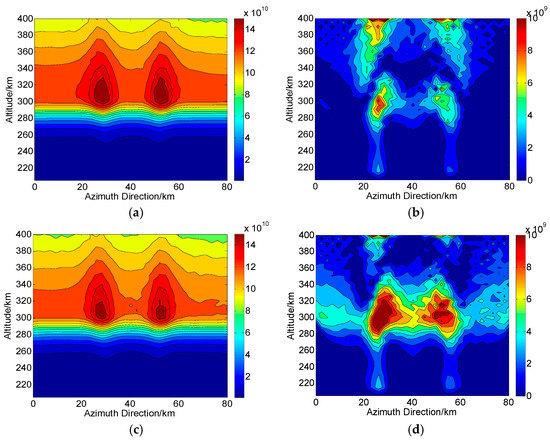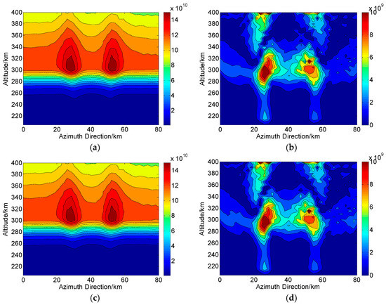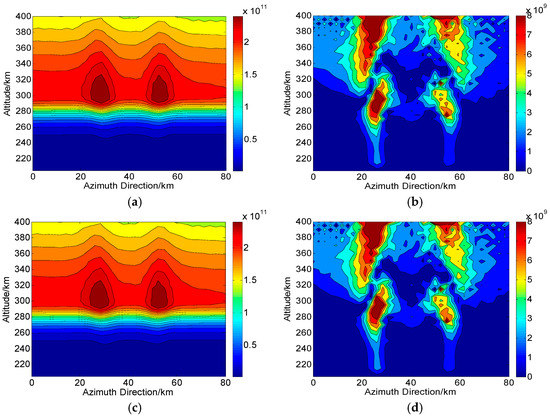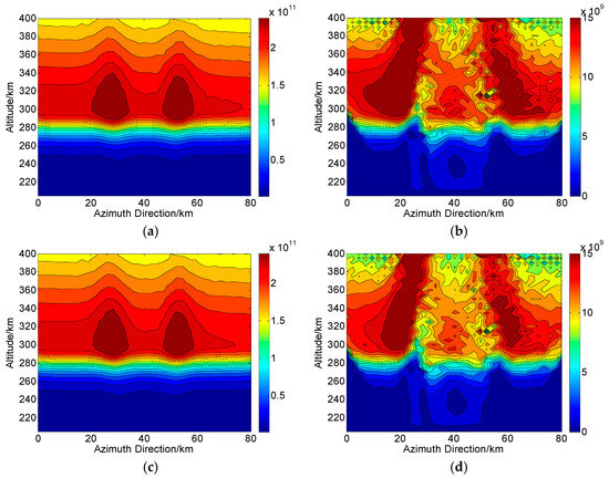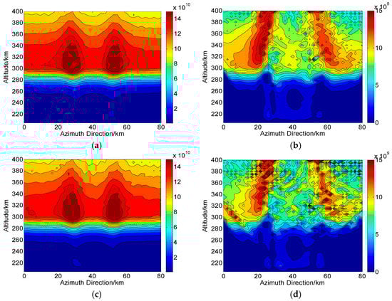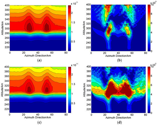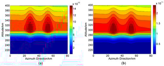 According to the operations in Figure 1, we assume that during one CIT simulation, the whole orbiting length of PolSAR along the azimuth direction is about 120 km and has 75 sampling positions (). The reconstructed area of the ionosphere is set to 80 km long and 204–400 km along azimuth and altitude directions, respectively. Correspondingly, each grid spacing is set to 5 km and 2.5 km along altitude and azimuth directions, respectively. For the distribution of the electron density, two small-scale artificial disturbances are then embedded. This new distribution with ionospheric disturbances is regarded as the “true distribution” to be reconstructed and used for comparison, as shown in Figure 4. On the ground, the imaging scene will be divided into 16 parts along azimuth direction, where each subimage is composed of pixels. Thus, according to the position of azimuth sampling, vectors of ray path and magnetic field, the can be calculated. By combining , and into Equation (10), the true corresponding to each ray path can further be determined. The scattering matrix measured for each ray path is then corrupted by the system errors and .