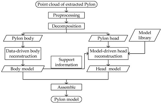 As mentioned in Section 1, according to power pylons’ structure characteristics, the pylon body and pylon head are reconstructed with different strategies. Preprocessing and decomposition methods are firstly introduced in Section 2.1 and Section 2.2. Then, a data-driven strategy based on line features to reconstruct the pylon body is introduced in Section 2.3, while a model-driven strategy to reconstruct the pylon head is introduced in Section 2.4.