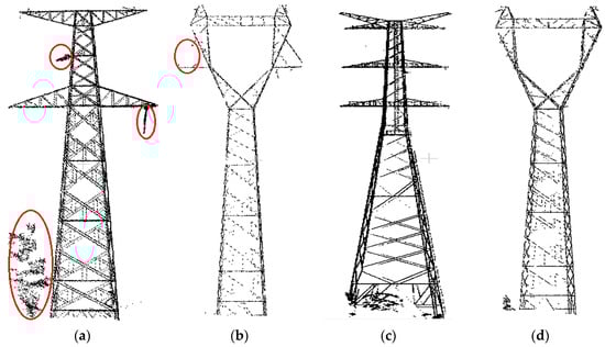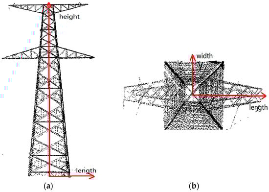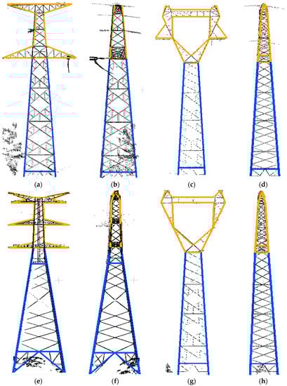 In the experiments, the point cloud of power pylons is firstly extracted from the original data by software, and then they are transformed to the pylon coordinate system automatically. Four typical extracted pylons are shown in Figure 11. As shown in Figure 11a, after the pylon is extracted, there are some vegetation and power line points around the pylons, which may influence the reconstruction results. As shown in Figure 11b, some data are missing, which will lead to partial reconstruction deviation. The pylon bodies of four types approximately are quadrangular frustum pyramids, and their shapes are determined by four principal legs. The pylon heads are more varied in shape and parameters of each type are different, adding complexity to head reconstruction.
