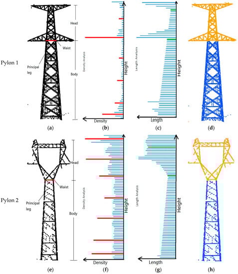 As principal supporting structures, the size of four principal legs are larger than that of other auxiliary components, leading to the number of points falling on the four principal legs of the pylon body being greater than that of auxiliary components; correspondingly, the color of the four principal legs are darker than other auxiliary components in Figure 4a. Therefore, the line features of four principal legs are opted to reconstruct the pylon body.