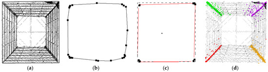 At first, the convex hull algorithm is used to construct a contour polygon from points in each bin. As shown in Figure 4b, the contour polygon contains corner points and other points. Then, to detect the corner points, a pipe algorithm [31] is applied to simplify the contour polygon (Figure 4c). Finally, the detected corner points of all bins are segmented into four subsets according to their orientation to the center of the minimum enclosing rectangle (MER). As shown in Figure 4d, each subset of corner points can be approximately described as a 3D line.