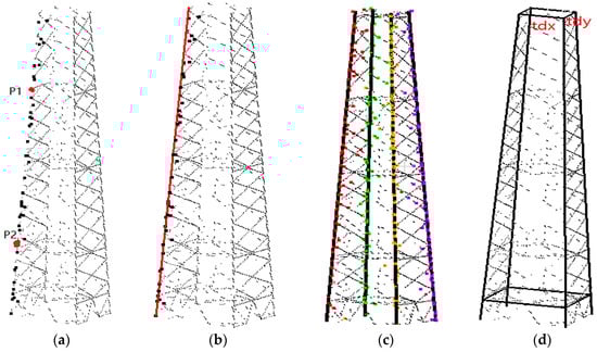 Pylon body reconstruction based on RANSAC: (a) corner points of one subset; (b) corner line fitting result of one subset; (c) fitting results of four corner lines; and (d) refined results of the pylon body. The original point cloud is colored in black.