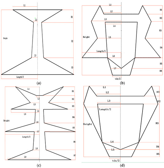3D parametric model library of pylon heads. The parameters are specified as the feature height, feature length and feature width. (a) Model 1; (b) Model 2; (c) Model 3; (d) Model 4.