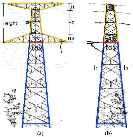 As shown in Table 1, most pylon heads have four basic parameters: tdx, tdy, Height, and Length. tdx and tdy are, respectively, the length and width of the waist plane, which can be derived from the results of body reconstruction as mentioned in Section 2.2. Height and Length are the size of the pylon head, which can be derived from the original pylon head point cloud information. Especially, some parameters can be inferred from other parameters. For example, in Model 1 (as shown in Figure 7a), H3 can be inferred by Equation (2) according to geometric relations, while L3 can be inferred by Equation (3) according to collinearity (in Figure 7a).