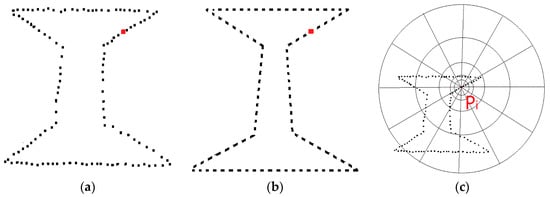 The shape context is a feature descriptor for measuring shape similarity and recovering points correspondences. It has been widely applied in many areas, such as digit recognition, silhouette similarity-based retrieval, trademark retrieval and 3D object recognition. The basic idea is to pick n points P = {p1, p2, p3, …, pn} on each contour of shapes, as shown in Figure 8a,b, and compute the shape context of each point pi. The shape context of pi is defined as the relative coordinates of the remaining n − 1 points. For simplicity, the relative coordinates are replaced with the number of points in each sector of the target template which is shown in Figure 8c. N concentric circles are established at logarithmic intervals in the region where the current point pi is the center and R is the radius, and the region is divided into M bins in a circumferential direction.