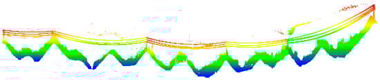 The average distance of the original point cloud used in the experiments is about 0.05 m. An example area of the original data is shown in Figure 10. The size of the shown transmission corridor is about 1881 × 40 m2, and the points amount is 43,879,821, including six power pylons. The point density of the example area is about 500 pts/m2 on average.