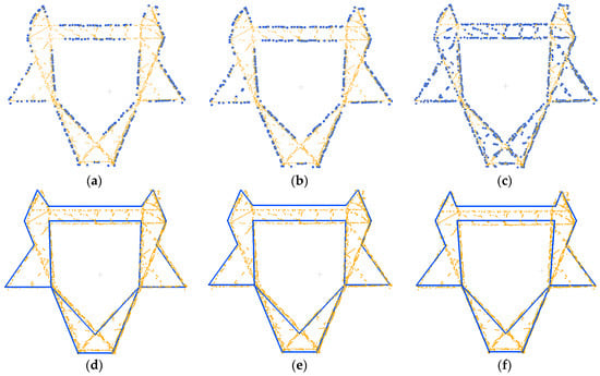 The reconstruction result in Figure 16a is closest to the original points, as all contour information of the pylon head is reserved. In Figure 16b, it is clearly shown that the difference between Figure 16a,b is small. This is because the topological constraint relationships, such as parallel, symmetric, have already been implied when defining the models, which makes the reconstruction model with high regularization. In Figure 16c, the structure of the model is still correct but the details of reconstruction are not precise. It is because that pylon parts with few points contribute little to the data coherence term in the energy calculation. The MH sampler and simulated annealing usually cannot find an absolute optimization.