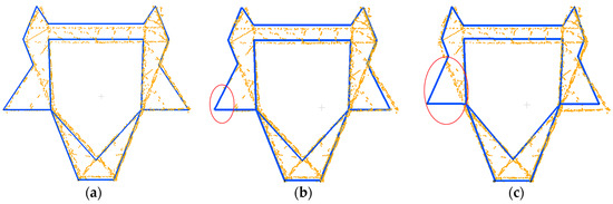 To test the method’s sensitivity to data loss, three levels of data loss are tested. In Figure 16, the point cloud in Figure 16a is complete without data loss; in Figure 16b, some points are missing but do not affect the completeness of head structure; and, in Figure 16c, the whole points of the left section are missing.