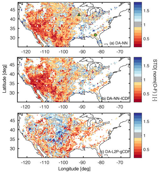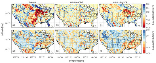 In the DA-NN experiment, the retention of local biases between the model and observations results in 2-year mean soil moisture estimates that show distinct spatial differences (defined as DA-NN minus OL) with respect to the model (Figure 1a). For example, DA-NN exhibits drier conditions in the predominantly agricultural areas of the Midwest and parts of the Northwest (eastern Montana, eastern Oregon and the Dakotas). In these regions, SMAP observes the effects of agricultural practices (e.g., tile drainage or tillage) that are not represented in the model (see e.g., He et al. [48]). For the agricultural areas subject to irrigation, these somewhat counter-intuitive results reflect the dry bias of the SMAP retrievals relative to the model (see e.g., Figure 4d in Kolassa et al. [25]) . In areas with extensive tile drainage, such as large parts of Iowa, the results reflect the expected behavior. Additionally, the spatial patterns of the DA-NN soil moisture estimates depend on the SMAP brightness temperatures as well as the ancillary retrieval inputs and are thus not purely observational features. The local bias correction applied in the DA-NN-lCDF experiment removes systematic differences between the model and the observations prior to the assimilation and—by design—results in mean soil moisture differences without strong spatial features (Figure 1b).