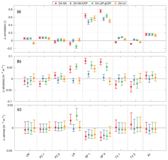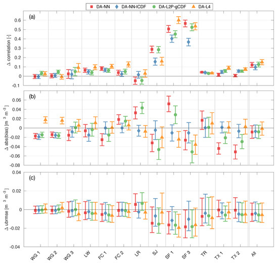 Change in surface soil moisture: (a) correlation, (b) absolute bias, and (c) unbiased root-mean-square error (ubRMSE) versus core validation site (CVS) measurements for the DA-NN (red squares), DA-NN-lCDF (blue diamonds), DA-L2P-gCDF (green circles) experiments and the DA-L4 (orange triangles). Skill changes have been computed against the OL corresponding to each experiment as DA minus OL. Error bars denote the 95% confidence interval. Reference pixel abbreviations are listed in Table 1.