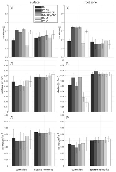 Overall, the soil moisture assimilation experiments and DA-L4 are able to achieve very similar skill improvements over their respective open loops. This supports the finding of De Lannoy and Reichle [17] that the assimilation of SMOS Tbs and soil moisture estimates—while locally different—resulted in model estimates with a comparable average skill against in situ measurements. Taken together, the results suggest that the NN method could be a viable assimilation alternative when a Tb assimilation is not possible (e.g., due to issues with the RTM calibration or a too high complexity of the RTM).