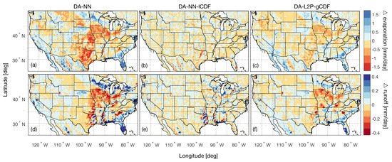 The differences in mean land evaporation for DA-NN and DA-NN-lCDF (Figure 6a,b) primarily reflect differences in the mean soil moisture state caused by assimilation of SMAP observations (Figure 1). For DA-NN, this includes a reduced evaporation in the region stretching from southeast of the Great Lakes to Texas, for which a strong drying was observed in Figure 1a, and an increased evaporation corresponding to the increased soil moisture in Florida. Generally, the land evaporation tends to be more sensitive to soil moisture in the Western US, however, owing to the smaller soil moisture changes introduced there, this increased sensitivity is not evident in the evaporation changes. For the DA-NN-lCDF experiment, the mean soil moisture state is—by design—not changed relative to the OL and as a result no notable changes in the mean land evaporation are introduced by the assimilation.
