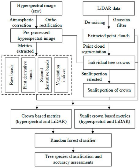 A general overview of the technique route for tree-species classification is shown in Figure 1. First, the hyperspectral raw data were preprocessed to minimize the impacts of atmospheric interference and terrain distortion. Second, four sets of metrics (raw bands, first derivative bands, second derivative bands and vegetation indices) were calculated and subsequently selected using principal component analysis (PCA). Third, each individual tree crown was extracted using point cloud segmentation algorithm (PCS) by the LiDAR data after de-noising and filtering, and then sunlit portions in each crown were selected from hyperspectral data. Finally, the LiDAR metrics computed from discrete LiDAR data within crowns and the hyperspectral metrics in individual tree crown and in sunlit portions were utilized to Random Forest classifier to discriminate five tree-species at two levels of classification.