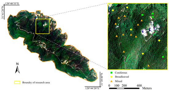 This study was conducted at Yushan Forest, a state-operated forest and national forest park, in the town of Changshu in Jiangsu Province, southeast China (120°42′9.4″E, 31°40′4.1″N) (Figure 2). It covers approximately 1103 ha, with an elevation ranging between 20 and 261 m above sea level. It is situated in the north subtropical monsoon climatic region with an annual precipitation of 1062.5 mm. The Yushan forest belongs to the north subtropical secondary forest, and it can be classified to coniferous dominated, broadleaved dominated and mixed forests [71]. The main coniferous tree-species are Chinese fir (Cunninghamia lanceolata (Lamb.) Hook.) and Masson pine (Pinus massoniana Lamb.). The major broadleaved tree-species include Sweet gum (Liquidambar formosana Hance) and Sawtooth oak (Quercus acutissima Carruth.), mixed with Chinese chestnut (Castanea mollissima BL.).