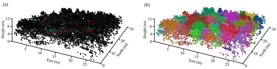 (a) Point cloud of one plot; and (b) the result of segmentation using PCS algorithm (each single tree corresponds to a color).