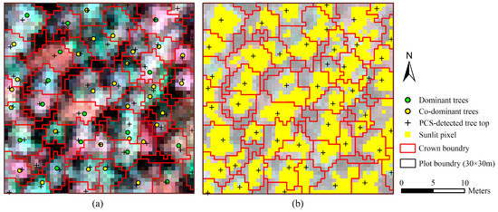 (a) Hyperspectral image with the location of trees (dominant and co-dominant), the PCS algorithm detected tree tops and the tree crowns within one plot (30 × 30 m2); and (b) map of sunlit portion of each crown which were selected from hyperspectral data.