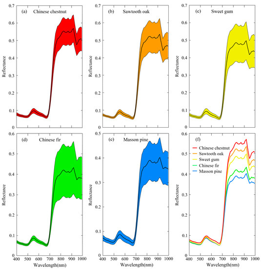 (a–e) Mean (bold line) and ±1 standard deviation of reflectance by species for sunlit crown; and (f) mean spectral reflectance of the studied species.