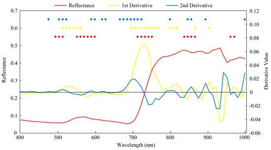 Derivative analysis is often used to enhance the target features and meanwhile weaken noises like illumination and soil background [76]. The first and second order derivatives are used most commonly. In this study, derivatives for metrics were extracted using reflectance data, and the first and second derivative bands (128 bands) were calculated.