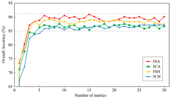 Evolution of overall classification accuracy with changing number of metrics. 5SA = Five tree-species classification using all metrics (LiDAR and sunlit hyperspectral metrics); 5CA = Five tree-species classification using all metrics (LiDAR and crown hyperspectral metrics); 5SH = Five tree-species classification using sunlit hyperspectral metrics; 5CH = Five tree-species classification using crown hyperspectral metrics.
