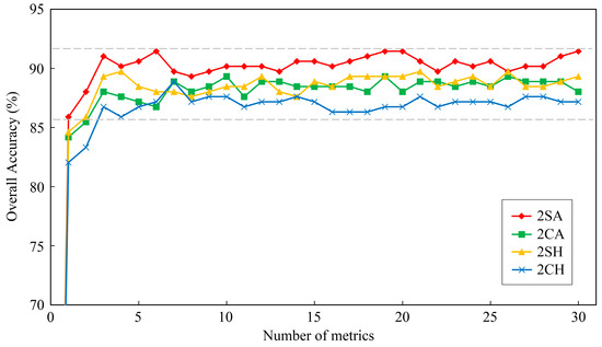 Evolution of overall classification accuracy with changing number of metrics. 2SA = Two forest-types classification using all metrics (LiDAR and sunlit hyperspectral metrics); 2CA = Two forest-types classification using all metrics (LiDAR and crown hyperspectral metrics); 2SH = Two forest-types classification using sunlit hyperspectral metrics; 2CH = Two forest-types classification using crown hyperspectral metrics.