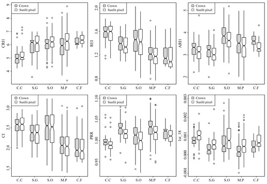 To compare the six metrics selected from most important metrics, CRI1, ARI1, PRR and 1st_18 were all calculated using green bands, and REI and CI were calculated using red edge bands. Green band and red edge region were both verified as informative areas of spectrum in vegetation studies [112], which is similar with the results of band selection using PCA algorithm (Figure 6). CRI1, ARI1, PRR and 1st_18 all had different values in sunlit crown and whole crown, yet the ranges of REI and CI in sunlit crown and whole crown were similar (Figure 9). Therefore, CRI1, ARI1, PRR and 1st_18 might be more sensitive to illumination than REI and CI. It could be explained that the green bands had shorter wavelength and the value was more likely influenced by scattering in crown than red edge bands [113].