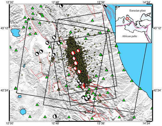 Tectonic setting of the 2016–2017 Central Italy earthquake sequence. Yellow circles are the aftershocks with ML 2.0 from Institute of Geophysics and Volcanology (INGV) between 24 August 2016 and 30 June 2017. Black boxes outline the spatial coverage of the Sentinel-1 images and Advanced Land Observing Satellite-2 (ALOS-2) images for the 24 August 2016 Amatrice earthquake. Red lines are the active faults from INGV. Green triangle denotes GPS sites used in this paper. The focal mechanism plots represent the moment tensor solutions from Global Centroid Moment Tensor (GCMT). Red focal mechanisms denote the 2016–2017 Central Italy earthquake sequence (Mw 5); black focal mechanisms denote the history earthquake (1976–2015, Mw 5).