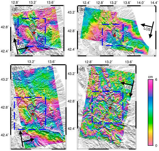 Coseismic interferograms of 24 August 2016 earthquake obtained from the ascending Sentinel-1 track T117 (a), the descending Sentinel-1 track T022 (b), the ascending ALOS-2 track 197 (c), the descending ALOS-2 track 092 (d). The red star corresponds to the epicenter of 24 August 2016 Amatrice earthquake [12]. The interferograms are rewrapped with an interval of 6 cm. The blue rectangle outlines the study area.