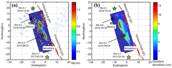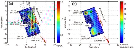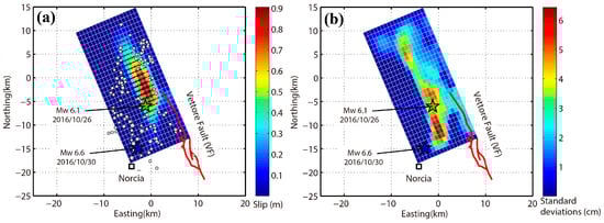 (a) Surface projection of the coseismic slip model of 26 October 2016 Visso earthquake. (b) Standard deviations in slip from Monte Carlo estimation with 100 perturbed datasets. Red lines represent the active fault. Gray dots denote the aftershocks of ML > 3 from 26 October to 29 October 2016 [12]. Color shows the slip magnitude in meters, and arrows correspond to the slip directions. White square denotes the city of Norcia. The green star denotes the epicenter of 26 October 2016 Visso earthquake, the blue star denotes the epicenter of 30 October 2016 Norcia earthquake [12].