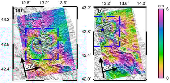 Coseismic interferograms of 26 October 2016 Visso earthquake obtained from the ascending Sentinel-1 track T044 (a), the ascending ALOS-2 track P197A (b). The interferogram are rewrapped with an interval of 6 cm. The red star corresponds to the epicenter of 24 August 2016 Amatrice earthquake [12]. The green star corresponds to the epicenter of 26 October 2016 Visso earthquake [12]. The blue rectangle outlines the study area.