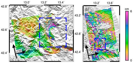 Coseismic interferograms of 18 January 2017 Campotosto earthquake obtained from the ascending Sentinel-1 track T117 (a), the ascending ALOS track P197 (b). The golden yellow star corresponds to the epicenter of 18 January 2017 Campotosto earthquake [12]. The interferograms are rewrapped with an interval of 6 cm. The blue rectangle outlines the study area.