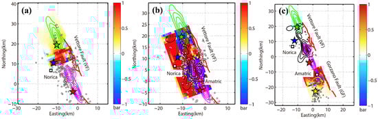 where is the fault-parallel shear stress change on the receiver fault plane (positive when sheared in the direction of fault slip), is the fault-normal stress change (positive when unclamping), and is the effective coefficient of friction. Increasing Coulomb stress, due to the stress readjustment following the event, tends to promote the failure of that plane. Decreasing the Coulomb stress, representing stress release, inhibits the failure. Although the Coulomb stress following an event is relatively smaller than the tectonic stress required for an earthquake, earthquake activity may be promoted when stress is increased on a fault by as little as 0.1 bar [30,31,32]. The effective coefficients of friction and the shear modulus were set to be 0.4 and , respectively. We examine the internal triggering effects on each earthquake of the 2016–2017 Central Italy earthquake sequence from preceding earthquakes. First, we calculated the static Coulomb stress change induced by the 2016 Amatrice earthquake on the fault plane of the 2016 Visso earthquake (Figure 10a, Table S1). Then, the joint effect of the first two large events (2016 Amatrice and 2016 Visso earthquake) on the 2016 Norcia earthquake was calculated (Figure 10b). Next, the joint effect of the first three events on the 2017 event was calculated (Figure 10c).