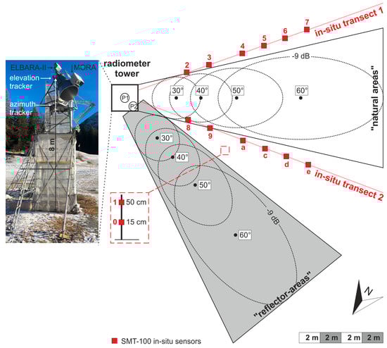 - The second generation ELBARA-II of the ETH L-band radiometer (ELBARA) operating at horizontal and vertical polarization within the protected part of the L-band (1400–1427 MHz). ELBARA-II technical specifications and its performance under field conditions are outlined by Schwank et al. [17,27]. The first generation ELBARA was designed and constructed in 2001 at the Institute of Applied Physics, University of Bern [28]. A number of ELBARA-II radiometers were produced by the company Gamma Remote Sensing AG (Gümligen, Switzerland) with the main purpose of calibration and validation activities supporting ESA’s SMOS mission [18]. The ELBARA-II assembly, mounted atop an 8-meter tower, includes a tracking system to allow for automated observations of brightness temperatures at different nadir angles and azimuth. For the work presented here, ELBARA-II is the key remote sensing instrument.